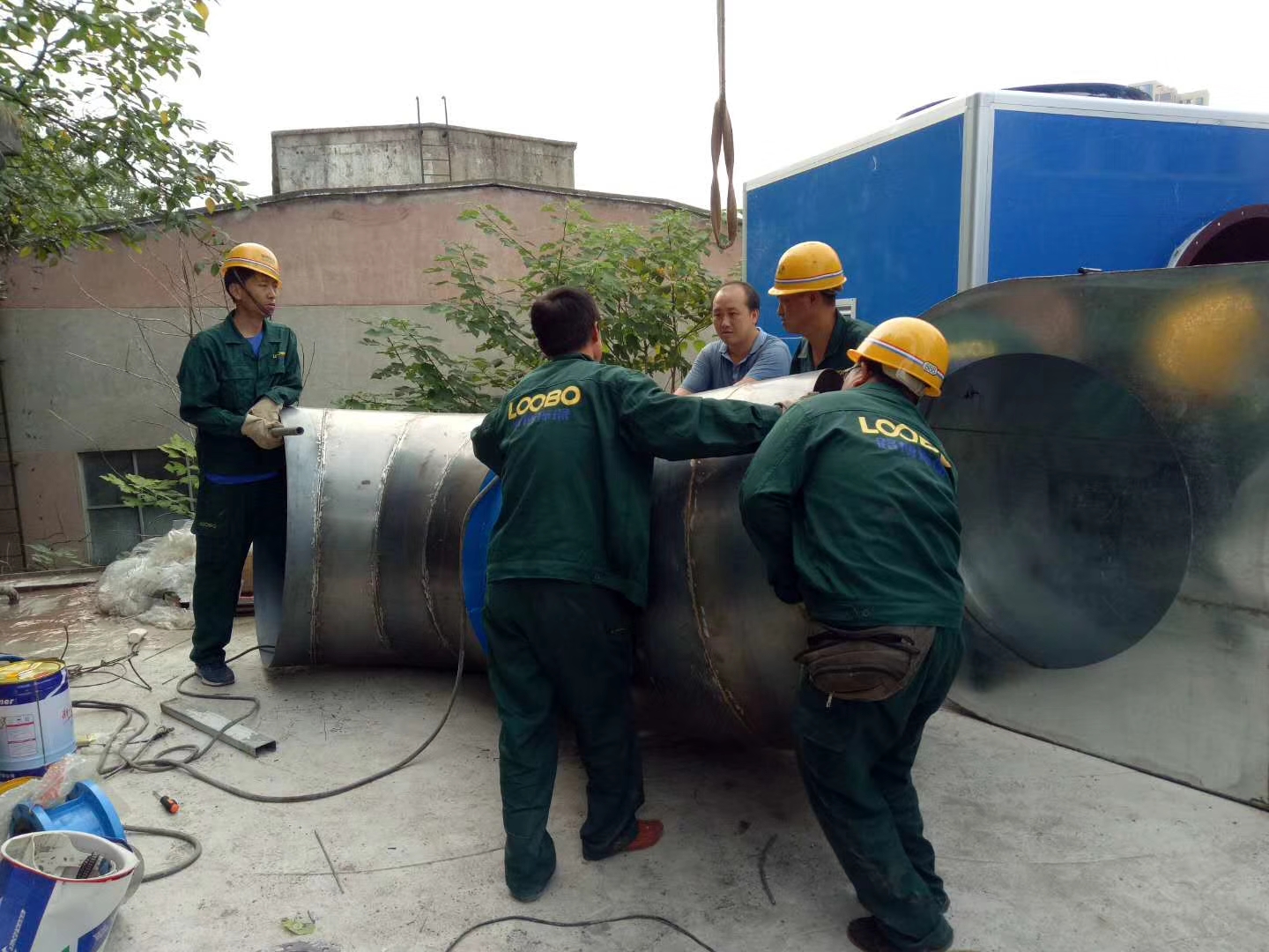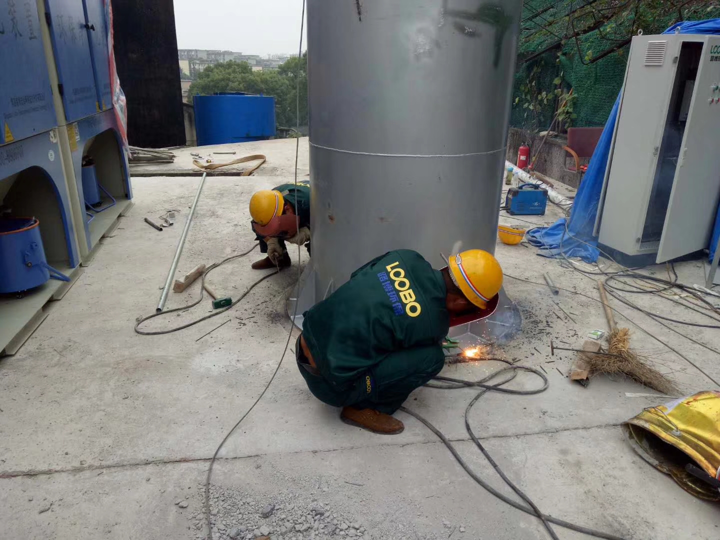 落砂房除塵項(xiàng)目施工前期,路博環(huán)保施工人員爭分奪秒,冒雨作業(yè)