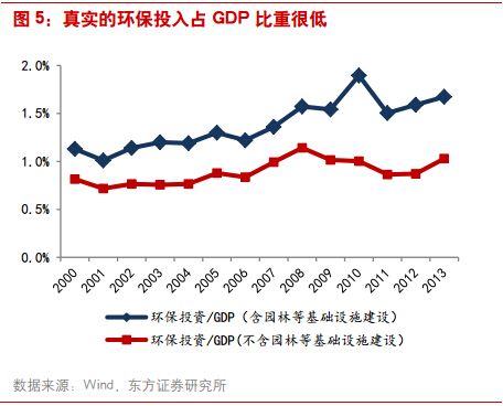 對于環(huán)保產(chǎn)業(yè),投資者一直存在一個疑問:官方口徑的投資力度很大,但從企業(yè)端看,規(guī)模卻很小,業(yè)績平淡。本質(zhì)上原因是我們的環(huán)保投入統(tǒng)計口徑問題,實際投入確實很小。按照世界慣例,環(huán)保投入需占當?shù)谿DP的2-3%,方能保障環(huán)境污染不再加劇,而之前20多年我們的環(huán)保投入長期保持在1%以下。剔除園林投入后,“十二五”的年環(huán)境治理投入僅在4000-5000億元。