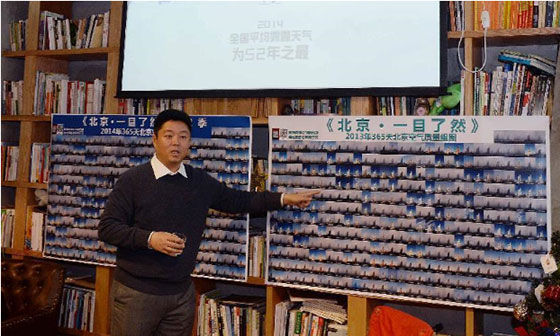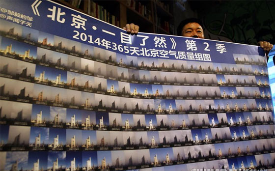??????? 這是鄒毅拍攝和拼版的2014年“一目了然”系列照片。鄒毅用2013、2014兩年時間,在同一地點(diǎn)、同一時刻用手機(jī)拍攝照片,記錄天氣變化狀況,并將兩年拍攝的700余張照片按年份匯總在一起,希望通過直觀的影像反映北京空氣質(zhì)量變化,讓更多的人關(guān)注霧霾、關(guān)注環(huán)境保護(hù)。本次分享會是他首次將兩年的拍攝成果一起集中展示。