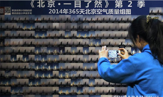 ??????? 鄒毅每天拍攝同一場景一張,組圖365張,讓大家一目了然看到北京的365天的天氣情況,呼吁公眾保護(hù)環(huán)境。這是他連續(xù)第二年以同樣方式記錄北京的天氣狀況。市民用手機(jī)拍下鄒毅的《北京·一目了然》第2季。