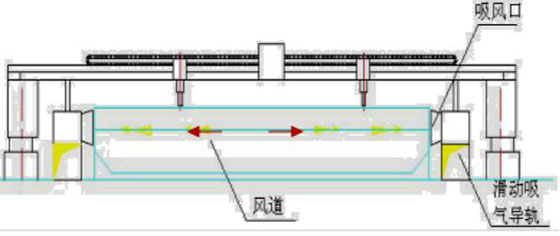 在切割平臺(tái)兩側(cè)安裝方形吸風(fēng)道,吸風(fēng)道上方裝有一個(gè)可隨切割機(jī)一起移動(dòng)的滑動(dòng)吸風(fēng)小車(chē)(每個(gè)切割機(jī)兩個(gè))。滑動(dòng)吸風(fēng)小車(chē)、切割頭、安裝在切割機(jī)沿橫梁方向的同一直線上。利用切割平臺(tái)上的格柵板與被切割鋼板形成煙氣通道,切割鋼板時(shí),產(chǎn)生的切割煙塵通過(guò)該煙氣通道由風(fēng)機(jī)負(fù)壓作用流向滑動(dòng)小車(chē)吸風(fēng)口,進(jìn)入方形吸風(fēng)道,最后進(jìn)入凈化器主機(jī)進(jìn)行切割煙塵凈化處理。